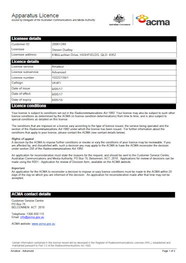 Apparatus Licence for